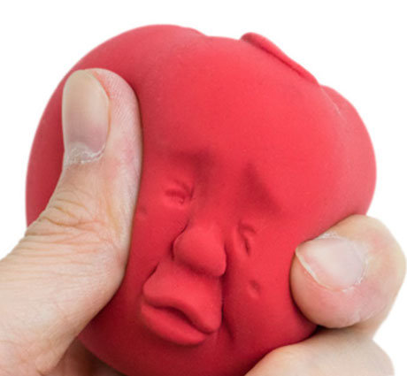 Er hält es aus und kommt immer wieder in seine Ursprungsform zurück. Dabei verzeiht er sein Gesicht zu witzigen Grimassen, sodass der Stress bald vergessen ist.