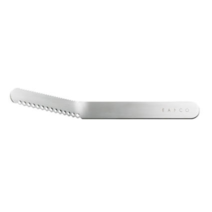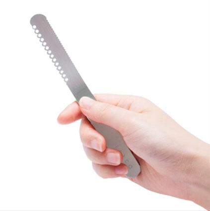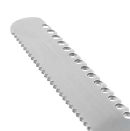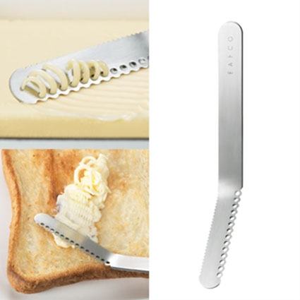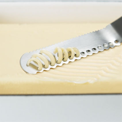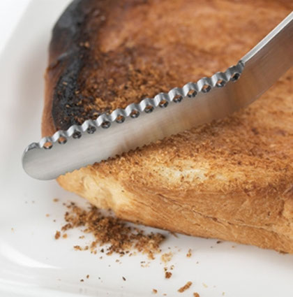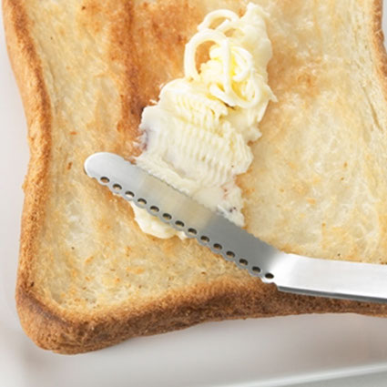 Die kleinen Löcher schaben die kalte Butter ab und machen Sie dadurch streichfähig. Die kleinen Zähne an der anderen Seite erleichtern das Entfernen von Brandstellen am Toast.
